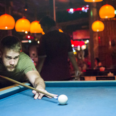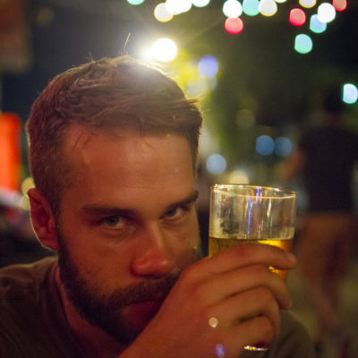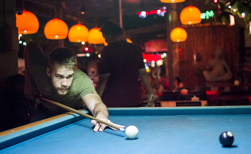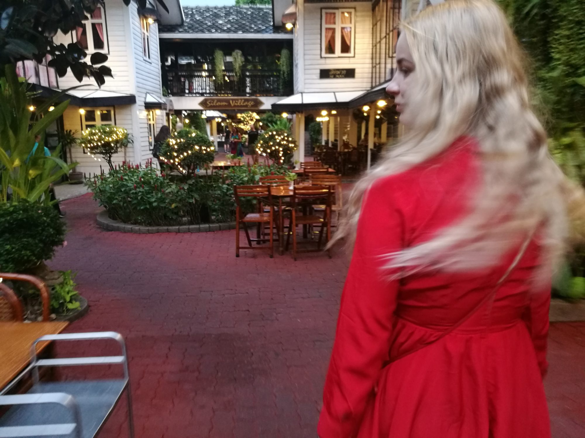 Efter vi lämnat caféet tänkte vi göra ett nytt försök att se solnedgången från hög höjd, den här gången ett annat högt hus (men inte lika högt) med en bar som heter Speak Easy. Och ännu en gång fick vi uppleva solnedgången från en taxi. Även detta stället var dock väldigt fint och hade goda drinkar. Efter så många dagar av hårt slit fick det bli en massage var. Det hade vi förtjänat! Kvällen avslutades ännu en gång på gatorna kring Khao San Road där vi åt, drack och spelade biljard. Jag vann.