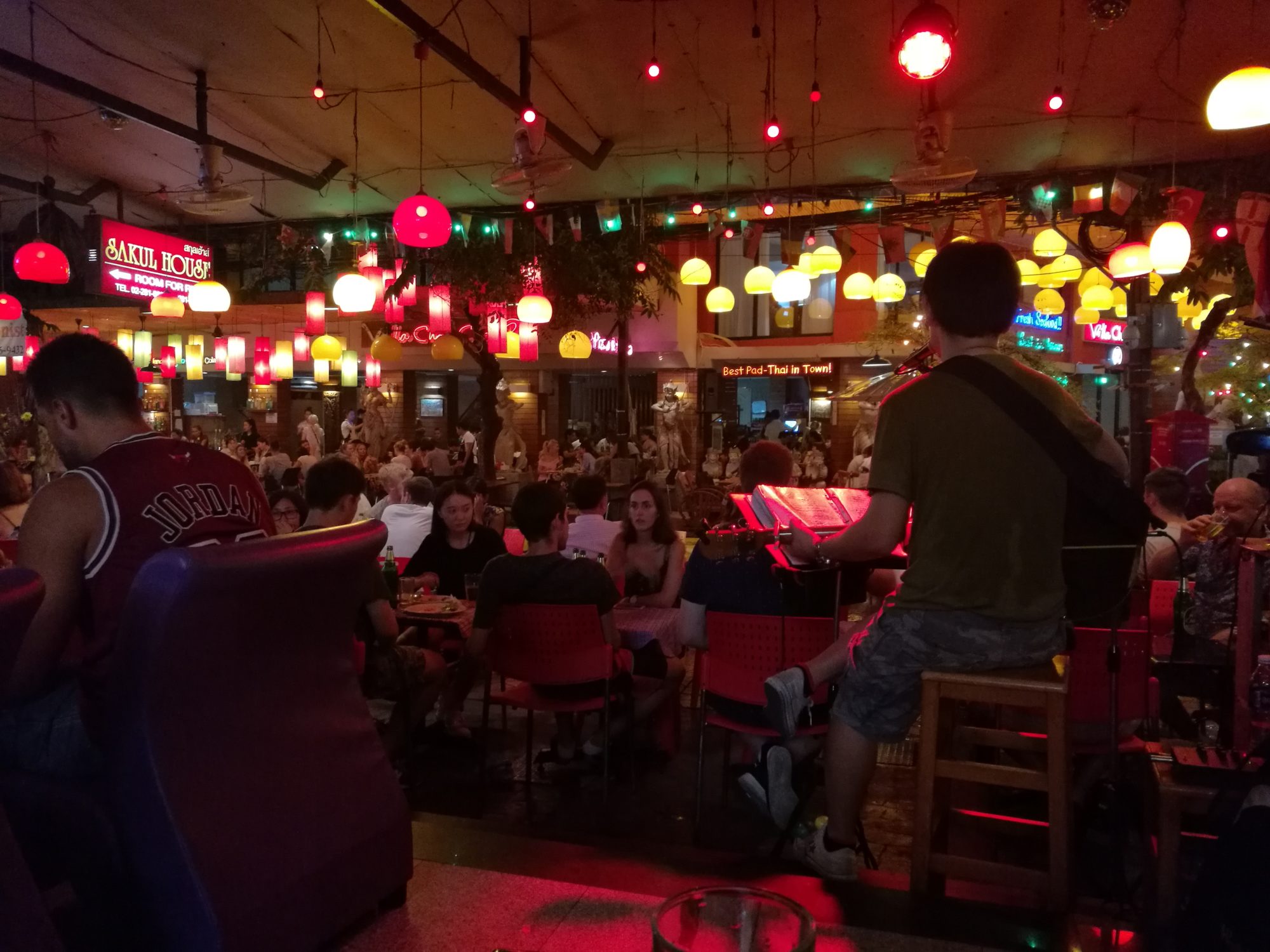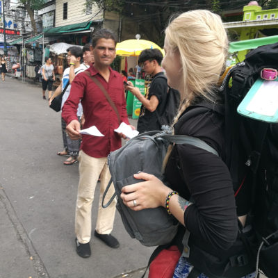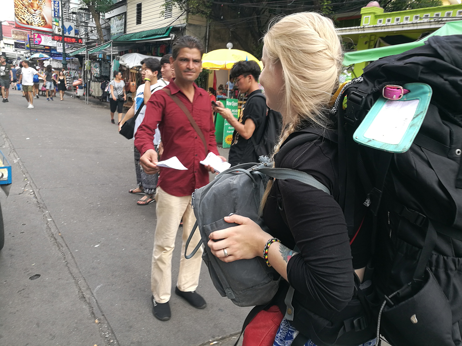 Dag två var det dags att spana in staden lite närmare och vi började med shoppingcenter i Siam där jag bland annat införskaffade stabilisator till min kamera, så filmer kommer. Därefter begav vi oss till China Town, åt lite street food och drack några öl. Ett mer hektiskt område än Silom som vi bor i, men intressanta och många intryck. För att få överdos av intryck och människor blev det sen en tur till Khao San Road. Vi valde en lugnare paralellgata för vårt förtärande av mat och alkohol men spatserade något varv på just Khao San Road. Vad finns där? Barer, fyllor och ungdomar samt äldre om vill vara ungdomar. Kaotiskt är väl ett ord som inte är olämpligt, men kul upplevelse. Vi kom att spendera mer tid i det området då vårt nästa boende låg nåra, men vi gick bara genom gatan för att ta oss till andra platser eller studera kaoset.