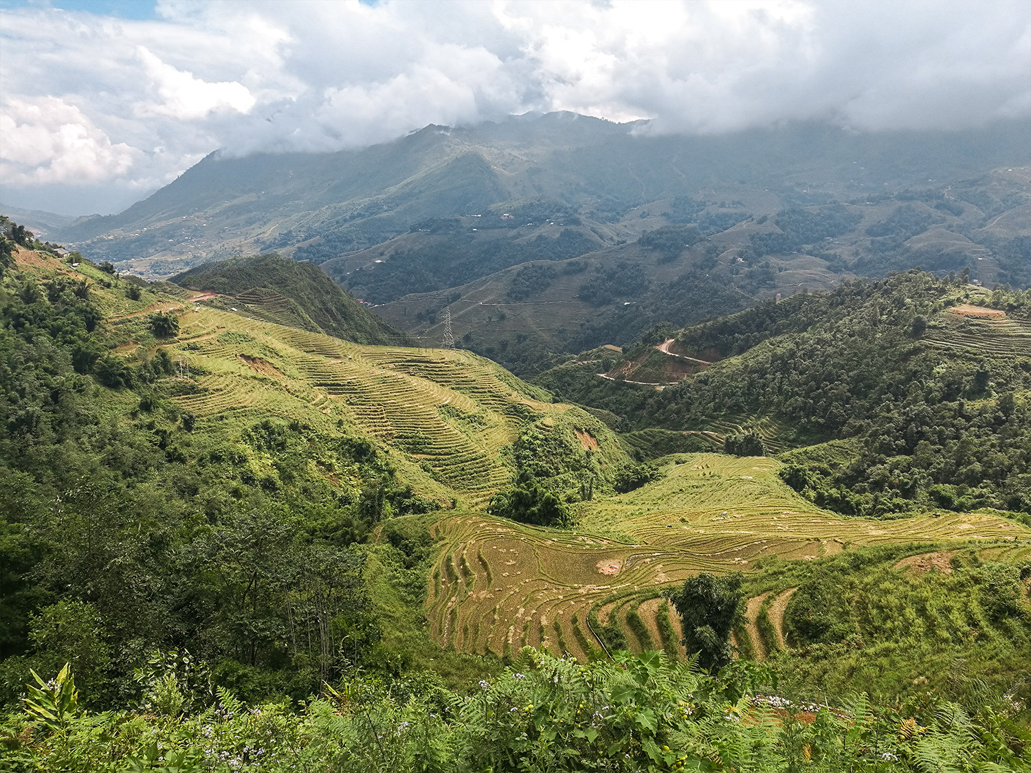 Vädret har inte varit på vår sida tyvärr, vi har haft mycket regn och moln. Inte många stora skurar men lite regn nästan hela tiden. Vissa delar av Vietnam har tydligen haft ordentligt oväder med många döda där flertalet hus kollapsat pga jordskred och översvämningar. Det är delvis därför vi varit här längre än tänkt, vi ville se stället i solljus. Vi har nu haft två dagar med tillräckligt bra väder för att gå runt och se oss omkring. Första dagen det var möjligt tog vi en kortare dagstur, ca 4 timmar, över risfälten, upp i bergen och till ett vattenfall. Nästa dag bestämde vi oss för att hyra en motorcykel och ta oss in till Sapa.